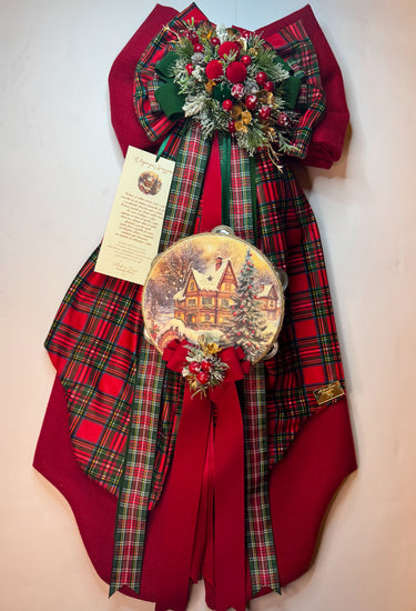 Un raffinato fiocco in velluto tartan e rosso, arricchito da un pendente a tamburello con delicato paesaggio invernale.