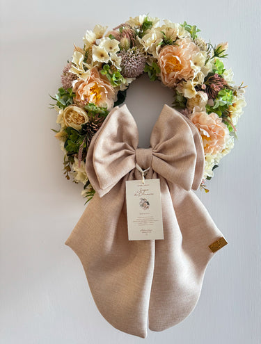 Il grande fiocco in lino naturale completa la composizione con un dettaglio raffinato e senza tempo, perfetto per impreziosire porte, pareti o ambienti speciali.