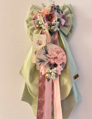 Elegante e raffinato, questo fiocco realizzato in fior di seta color verde salvia è pensato per chi desidera un dettaglio delicato ma d’impatto. La composizione è impreziosita da fiori rosa armoniosamente abbinati e da un romantico tamburello decorativo con peonia, simbolo di bellezza e prosperità.