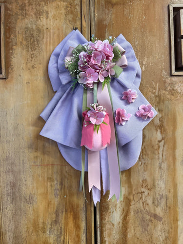 Un fiocco primaverile,elegante ornamento tessile ispirato alla freschezza e ai colori della primavera. Realizzato in tessuti leggeri come il cotone, presenta tonalità vivaci e delicate, come il verde pastello, il rosa cipria, il lilla e il giallo tenue.Decorato con motivi floreali,richiamano la natura in fiore.