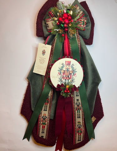 Un elegante fiocco in velluto montone bordeaux impreziosito da dettagli in velluto verde millerighe, che richiama l’intramontabile fascino britannico. A completare il design, un raffinato pendente a tamburello con lo Schiaccianoci raffigurato, simbolo di tradizione e magia natalizia.