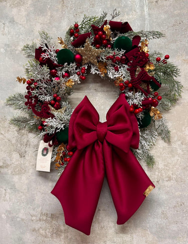 Al centro spiccano due piccoli cervi in velluto, simbolo di eleganza e dolcezza, che trasformano questa ghirlanda in un vero e proprio racconto natalizio. Il grande fiocco rosso in tessuto completa il design, donando un tocco di tradizione e luminosità.