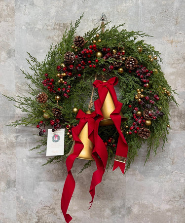 Un classico intramontabile che celebra la magia delle feste: questa ghirlanda dal diametro di 50 cm è realizzata con rami verdi naturali dall’aspetto fresco e autentico, arricchita da bacche rosse brillanti, pigne innevate e sfere dorate.