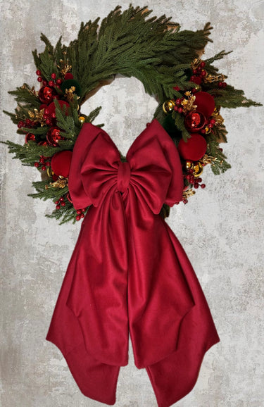 Un capolavoro natalizio dallo stile elegante e scenografico. La base naturale verde avvolge e valorizza sfere in velluto rosso intenso, illuminate da raffinati decori dorati che donano calore e preziosità. Al centro, un fiocco romantico in velluto rosso completa la composizione con un tocco di charme.