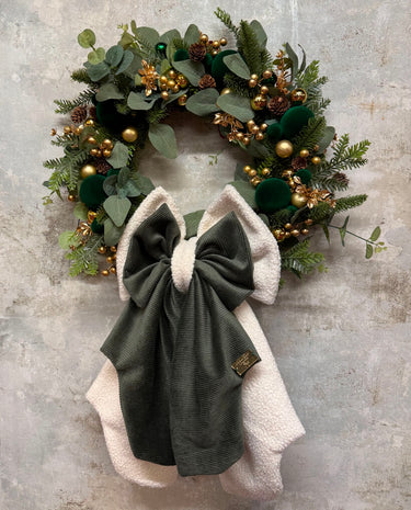 Un design naturale ed elegante che unisce il fascino del verde intenso con la delicatezza dei dettagli in velluto. La base di eucalipto dona freschezza e armonia, mentre le sfere in velluto verde aggiungono profondità e raffinatezza. Al centro spicca un grande fiocco in velluto verde e panna naturale, studiato con gusto stilistico per impreziosire l’insieme e renderlo unico.